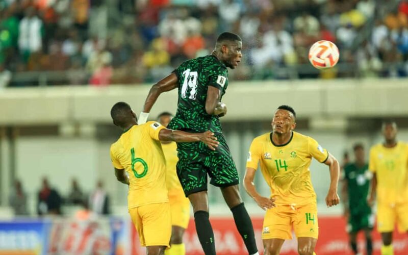 PHOTO CAPTION: Nigeria’s Paul Onuachu wins a header during their World Cup qualifier against South Africa in June 2024, which finished 1-1.