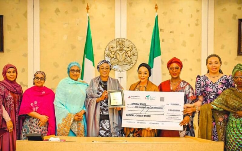 At the event, the First Lady presented a cheque for N100 million as well as a plaque to the wife of Enugu State governor, Mrs. Nkechinyere Mbah, who received the honour on behalf of Enugu as “Model Green State.”