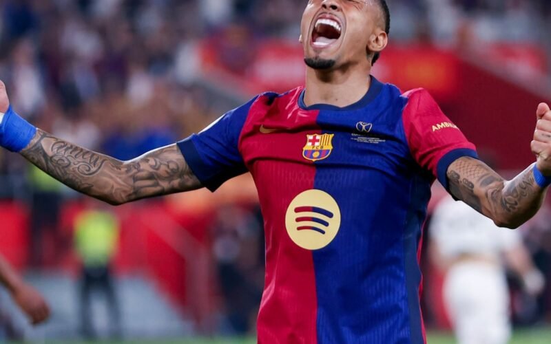 PHOTO CAPTION: Barcelona’s Raphinha celebrates after scoring a goal.