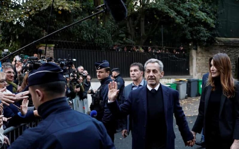 *PHOTO CAPTION: Former French president Nicolas Sarkozy (2nd right) waves to supporters as he leaves his house with his wife, Carla Bruni-Sarkozy in Paris, en route prison, 21 October 2025. Photograph: Benoît Tessier/Reuters.