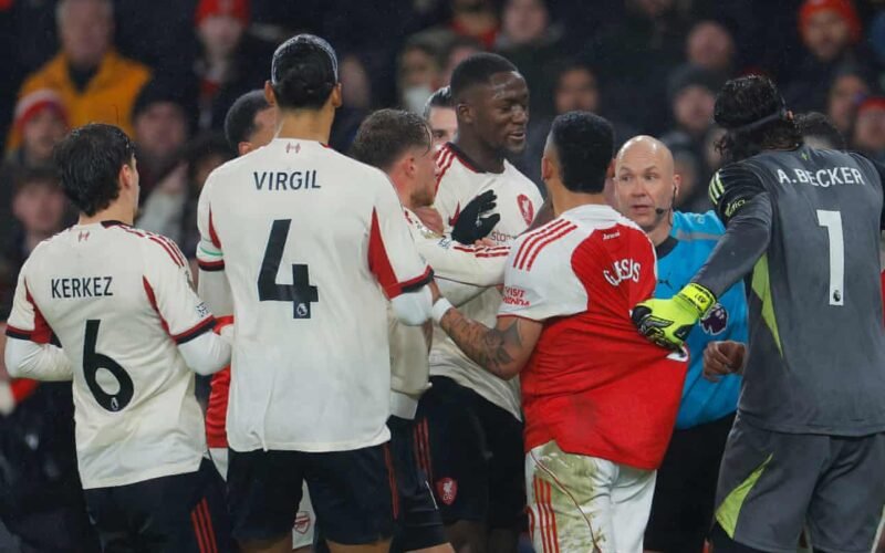 The half’s moment of controversy arrived 10 minutes before the break when Frimpong went down awkwardly under pressure from Piero Hincapié in the area, although it was hard to tell if there was any significant contact. He stayed down as play continued, with Leandro Trossard seeing his shot deflected wide at the other end. Liverpool’s players immediately surrounded the referee Anthony Taylor, with Declan Rice and Virgil van Dijk exchanging some choice words.