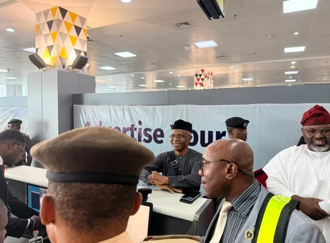 *PHOTO CAPTION: El-Rufai (seated, smiling) at the Nnamdi Azikiwe International Airport… today.