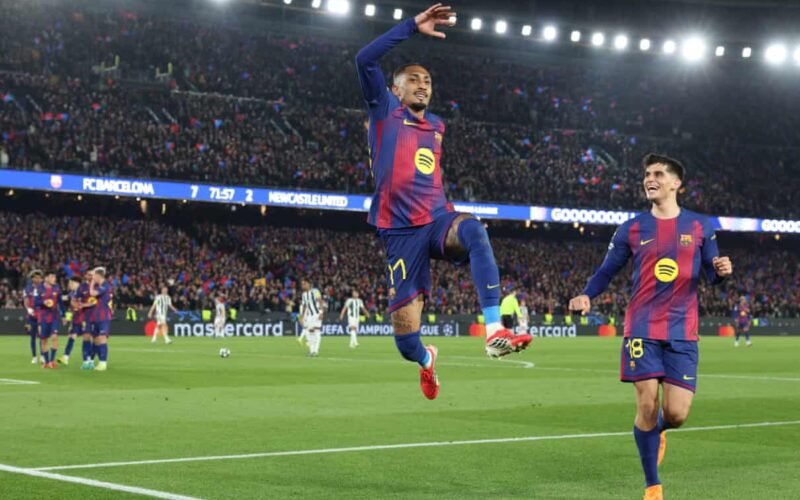 *PHOTO CAPTION: Barca’s Raphinha jumps for joy after rounding off the second-half scoring.