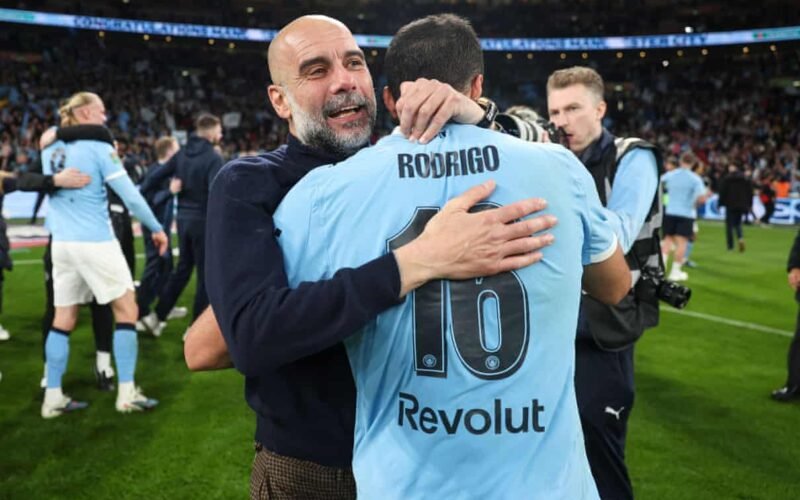 *PHOTO CAPTION: Guardiola celebrates with Rodri after Manchester City’s first trophy of the season… yesterday.