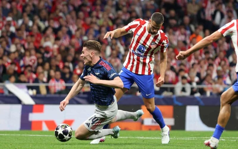 Atlético flickered in the early going. Rice had to block from Alvarez and the hosts had the moment when they pieced together a lengthy passing move from back to front on 15 minutes that ended with Alvarez unloading a shot from the edge of the area. David Raya turned it behind.